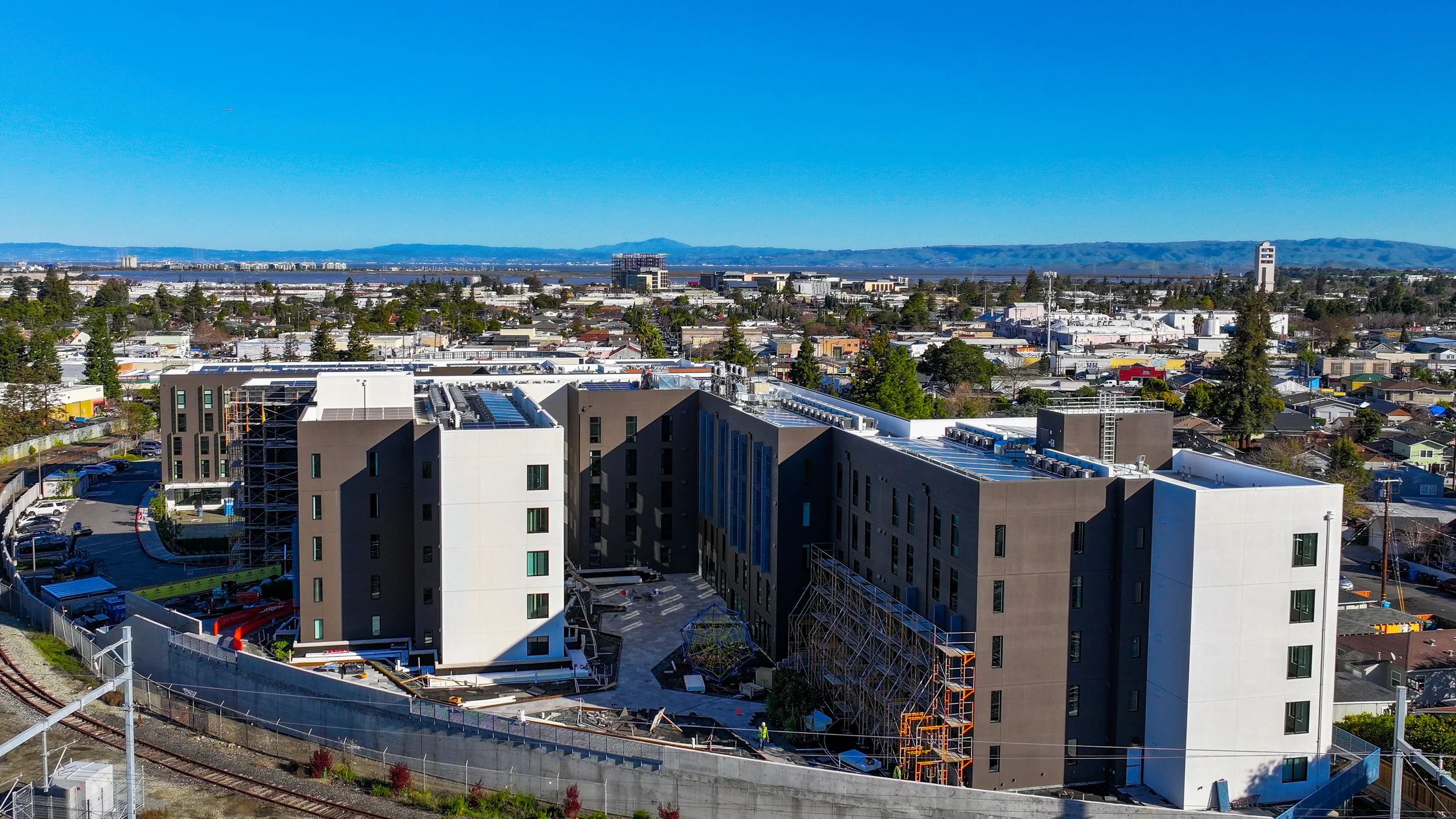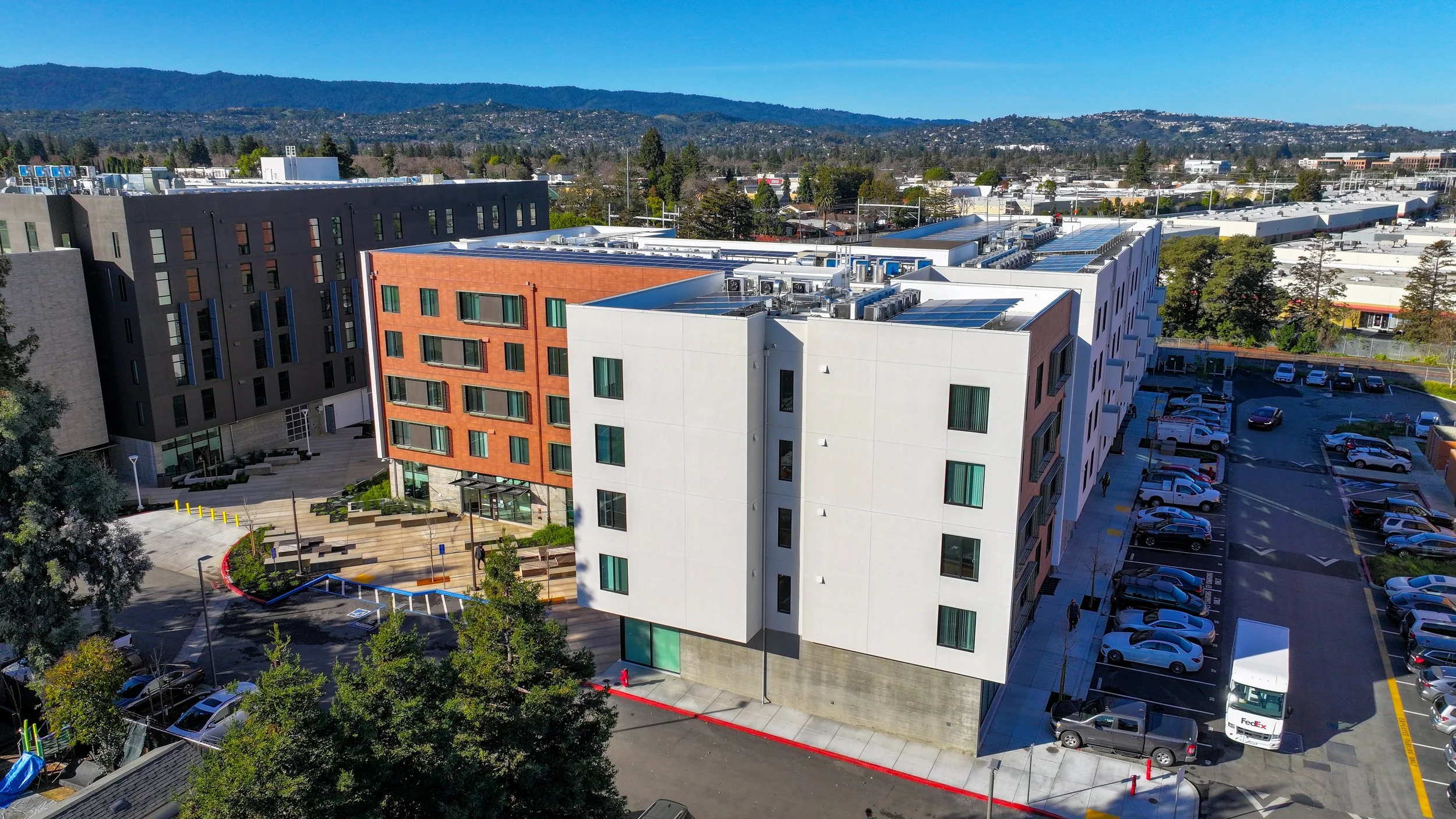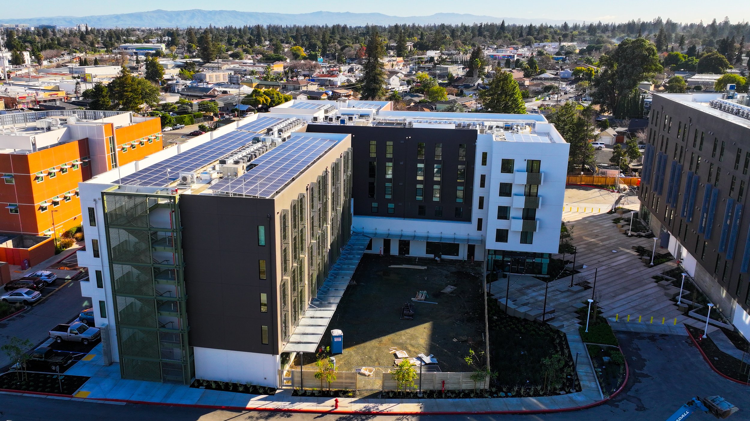 Project is a mixed-use development including affordable housing, childcare center and community center. Housing consists of two buildings on a 3.2 acre site with a pedestrian mews between the buildings. Buildings are wood frame over concrete podium.
