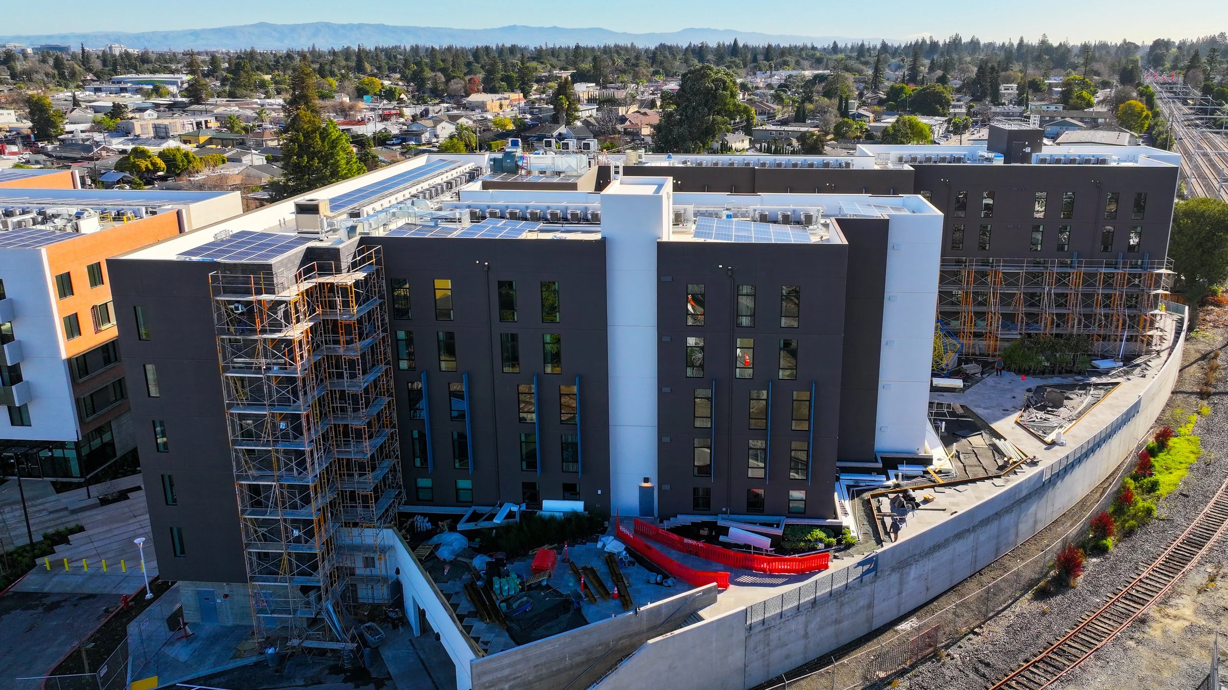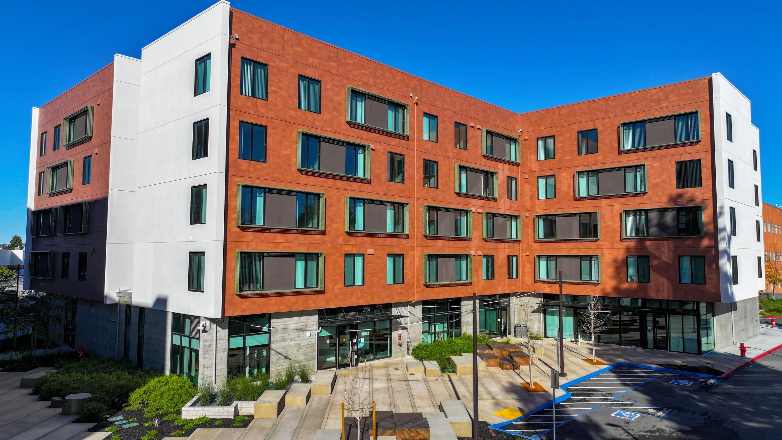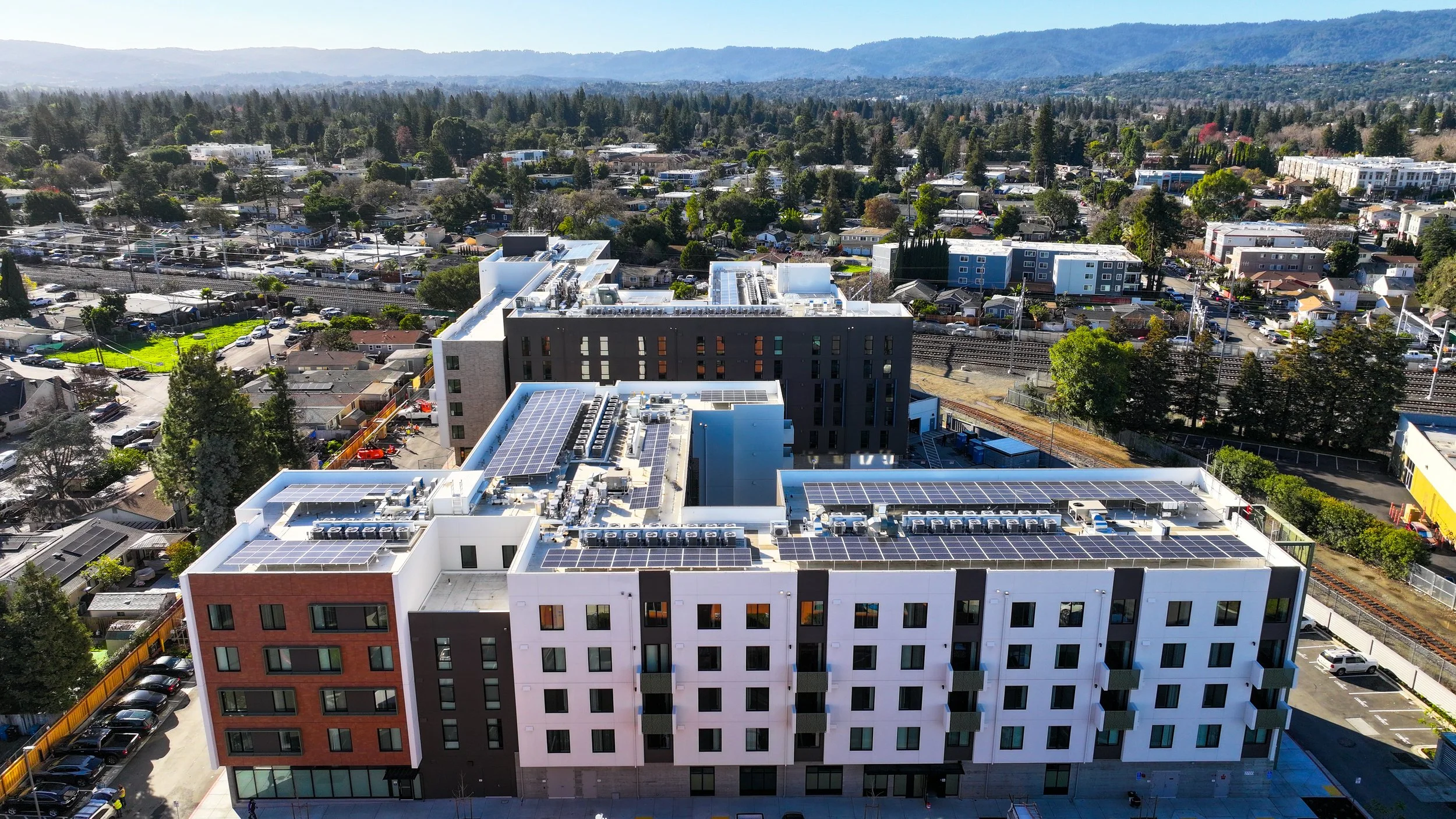 Project is a mixed-use development including affordable housing, childcare center and community center. Housing consists of two buildings on a 3.2 acre site with a pedestrian mews between the buildings. Buildings are wood frame over concrete podium.